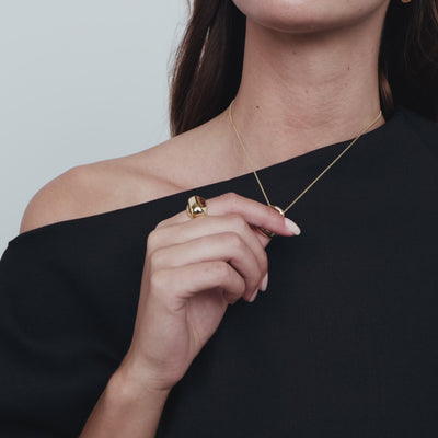 Ten zachwycający naszyjnik, zaprojektowany w Kopenhadze, powstał z najwyższej jakości srebra próby 925, które następnie pokryto grubą warstwą 18-karatowego żółtego złota. Jego sercem jest duża, rzeźbiarska zawieszka (23,5 mm) o organicznym, nieregularnym kształcie, inspirowanym luksusowymi okuciami torebek "it-bags". To, co czyni ten model absolutnie wyjątkowym, to wewnętrzna część jego powierzchni ozdobiona cyrkoniami w technice pavé.